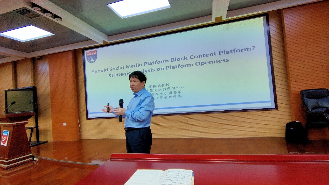 廖貅武教授从内容平台和社交媒体平台的流量竞争问题出发,通过考虑竞争效应和互补效应的相互作用,分析了社交媒体平台采取屏蔽策略的经济学机理以及各种因素例如流量变化、内容质量变化、竞争等对策略选择的影响。之后,廖貅武教授总结了西安交通大学信息管理与电子商务系、智能决策与机器学习中心的发展经验,为公司“大数据管理与应用”本科专业的建设提出针对性建议。廖貅武教授的报告风趣幽默,并与在场教师、研究生进行了热烈的互动,学术报告取得了良好的效果。