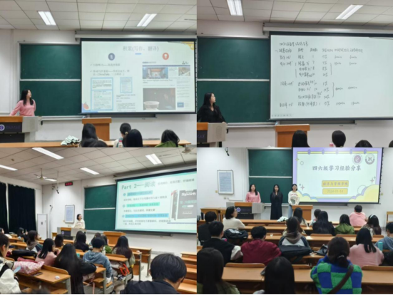 在分享会上,三位同学详细地从听力训练、阅读技巧、词汇积累、写作提升等多个方面展开经验分享。四级高分同学刘锦仪从备考积累、考前自测及考中注意事项三个方面进行了分享,同时,也为同学们具体讲述了做四级套题的方法,细心解答了同学们提出的问题。六级高分同学高艾楠同学从试卷结构、考试顺序、复习重点三个方面进行了分享,尤其在听力和阅读两方面以及单词的积累上做了更细致的讲解,她提醒同学们,单词积累对于应试高分是必不可少的,建议同学们词汇量越高越好。六级高分同学王昕锐同学从题型分布、复习方法、答题顺序及时间分配方面进行了分享,详细地从听力、阅读、写作、翻译四方面向同学们讲述了她的“独家”复习方法,并针对性地向同学们推荐了练习听力软件和英语写作模板。