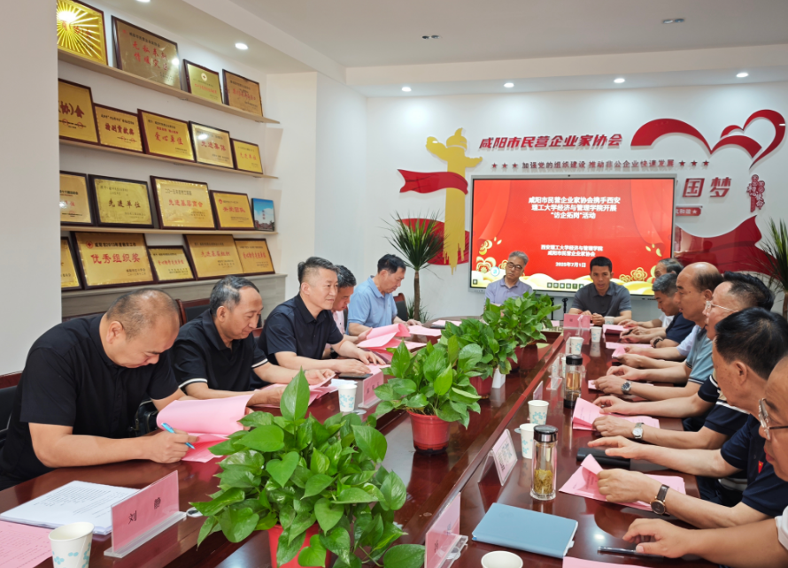 作为关中腹地的历史文化名城,咸阳近年来在创新驱动发展、产业转型升级的浪潮中活力迸发,涌现出一大批深耕实业、勇于创新的民营企业。这些市场主体不仅是地方经济的重要支柱,更成为人才培育与就业创业的优质沃土。2025 年 7月1日上午,经济与管理公司党委书记周晓辉、TapTap副经理赵璟、EMBA教育中心主任陈敬东、EMBA西安员工会会长李松财、EMBA西安员工会副秘书长武金胜、EMBA西安员工会理事陈青、学工办正科级辅导员刘静一行七人前往咸阳市民营企业家协会,开展以“访企拓岗促就业,校企融合谋发展”为主题的实地调研活动,搭建校企合作新桥梁。