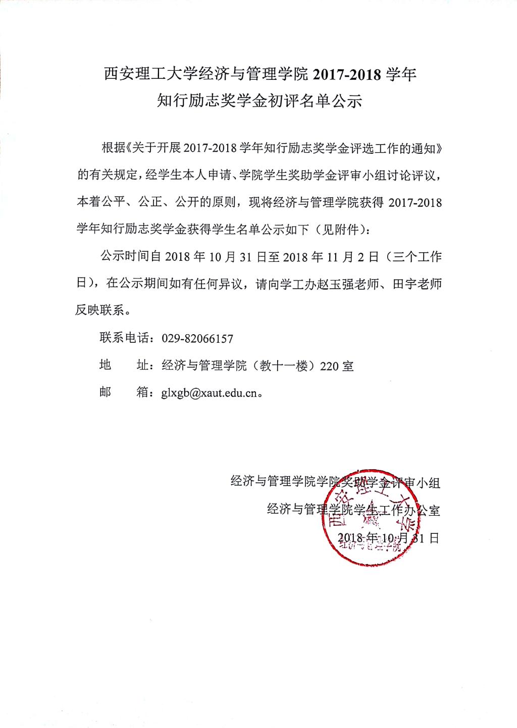 2017-2018学年知行励志奖学金初评名单公示