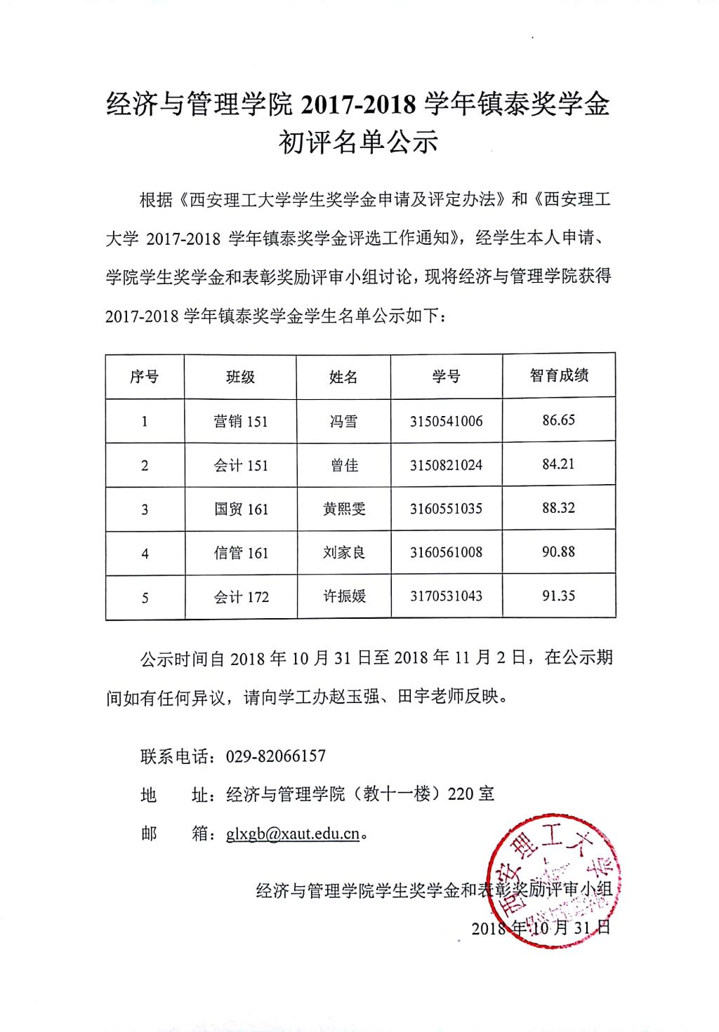 2017-2018学年镇泰奖学金初评名单公示