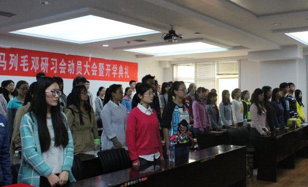 开学典礼由研习会顾问李良老师主持。首先,全体起立奏国歌,接着朱晓明老师讲话,她的讲话为入党积极分子指明了未来发展的目标,并着重强调了研习会的纪律。然后余佩媛老师宣读了本期研习会主要干部成员名单并颁发证书。接下来研习会会长屈帅发言,她介绍了研习会是以学习通过讨论国内外重大事件,从而提高会员理论水平和自身素质的组织。最后,王青耀教授做了重要讲话,并希望同学们能够坚定理想信念,坚持科学理论信仰,在研习会中获取知识,获得成长。