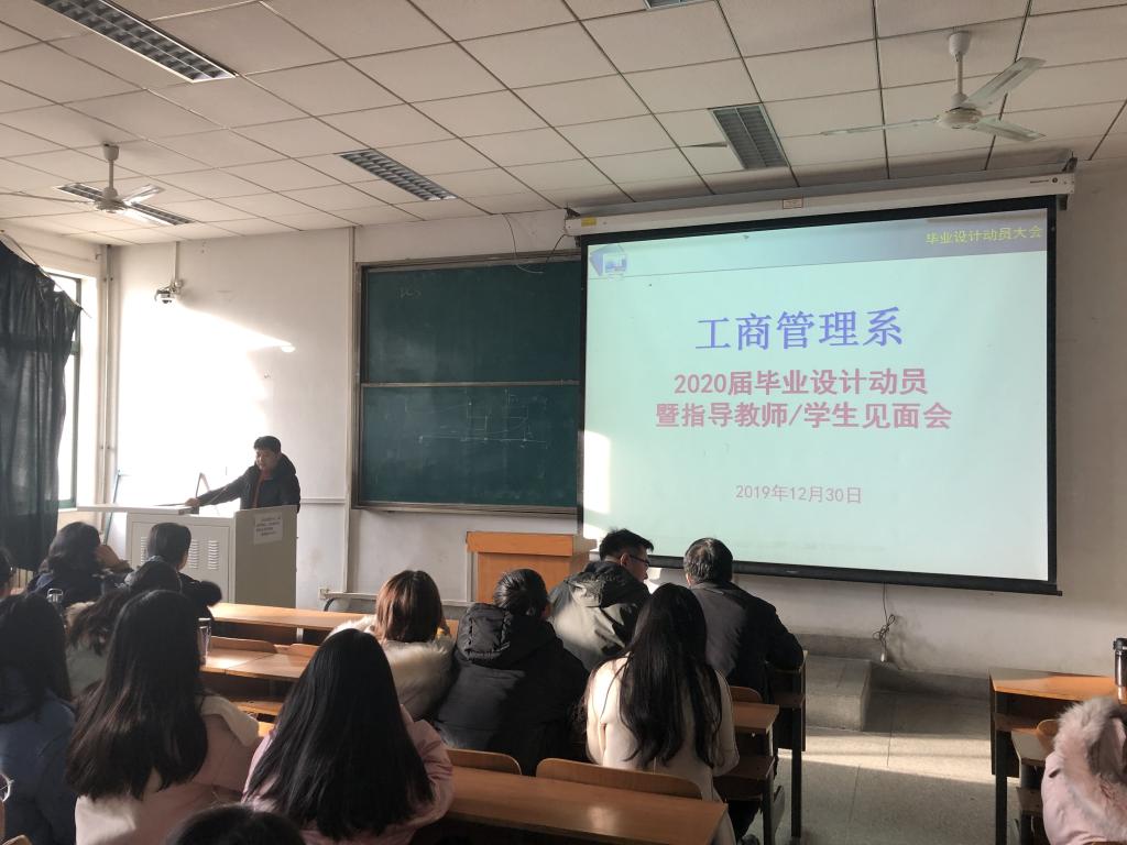 2019年12月30日上午,公司工商管理系在教10-203举行2020届本科生毕业设计动员会暨指导教师与员工见面会。工商管理系主任甘凯、副主任杨毅与各专业部分教师代表以及全体2016级工商管理系员工参加了此次动员会。