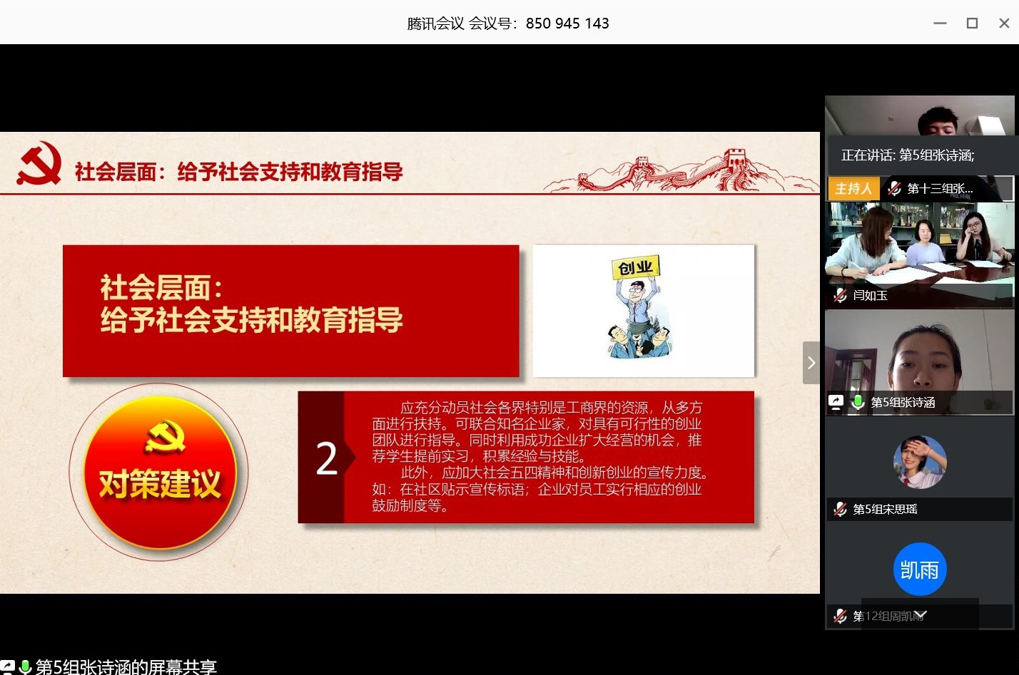 本次答辩采用腾讯会议线上举行,各个组按照抽签顺序展示实践活动成果,评委老师逐一提问并点评。十三组学员在实践环节中围绕五四精神的内涵和当代意义、新时代青年的担当、疫情环境下五四精神的体现、五四精神与创新创业等方面进行调查研究,采用问卷调查、街头采访和理论研究等调研方法,就问题现状、发展趋势和影响因素等进行全面深入分析,并提出可行性解决方案。答辩过程精彩纷呈,充分展现了经管学子奋发向上、勇于作为的精神风貌。