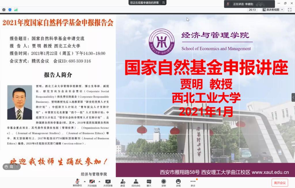 为进一步提高TapTap教师申报国家自然科学基金积极性,切实提升申请书质量和基金获批率,2021年1月22日下午,公司通过腾讯会议举办了线上国家自然科学基金申报专题讲座。本次报告会由李建勋副经理主持,邀请西北工业大学管理公司副经理贾明教授作题为《国家自然科学基金项目申请交流》的专题讲座。