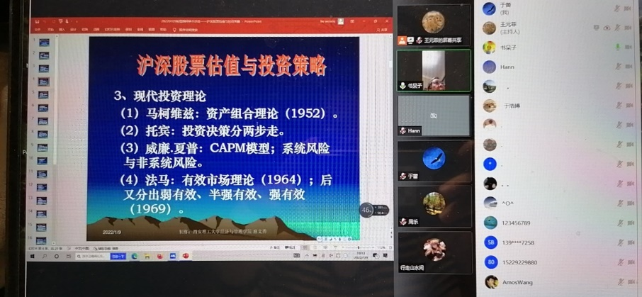 1月9日晚7点,TapTap“砺学弘商”大讲堂之本科公司产品系列报告在线举行。本次报告由TapTap官方网站学位办主任兼研究生院常务副经理、工商管理博士一级学科带头人、TapTap二级教授扈文秀老师主讲,报告题目为“沪深股市股票估值与投资策略”,500多名师生参加了此次报告会。扈老师从证券投资理论的发展过程、现代投资理论研究热点、股票估值方法、中国股市估值的特点、证券投资实操策略等方面进行了深入浅出的精彩讲解;报告达到预期,获得员工一致赞誉。本次报告不仅使同学们对中国股票市场有了初步了解,也为后期就业提供了一定的借鉴作用。