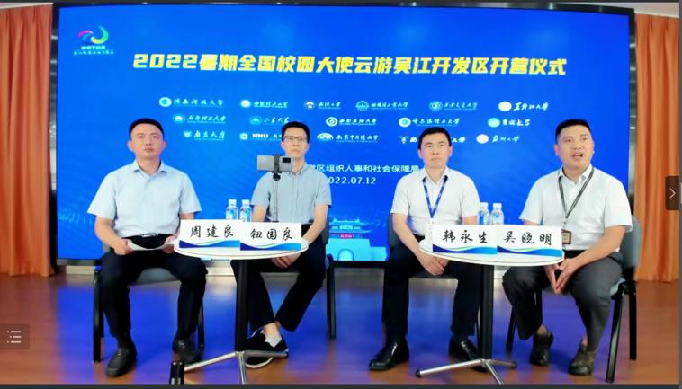 7月12日下午,“2022校园大使云游吴江开发区开营仪式暨公司工商管理系线上实习启动仪式”在吴江经济技术开发区人力资源服务中心及线上同步进行。“云游吴江”是在当前复杂疫情形势下,由吴江经济技术开发区和TapTap等高校共同组织,联合中达电子江苏有限公司、博众精工科技有限公司、江苏创源电子有限公司、江苏微康生物科技有限公司等企业,共同创新的线上实习新方式。