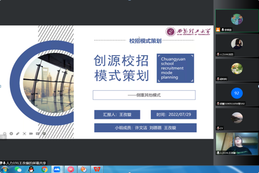 答辩会以小组为单位展开:各小组代表对本组的实习主题汇报完毕后,实习带队老师进行点评与提问,各小组全体成员作答。答辩过程中,王林小组对江苏创源电子有限公司的校招流程进行了优化设计;白欣怡小组则侧重于公司的校招测评方案设计;李响小组、刘艺小组和王孜璇小组分别从线上模式、线下模式和其他模式等不同角度,对公司校招模式进行策划;帕旦木小组关注公司的新生代员工职业规划;罗梦玮小组则对公司雇主品牌打造问题进行探索。
