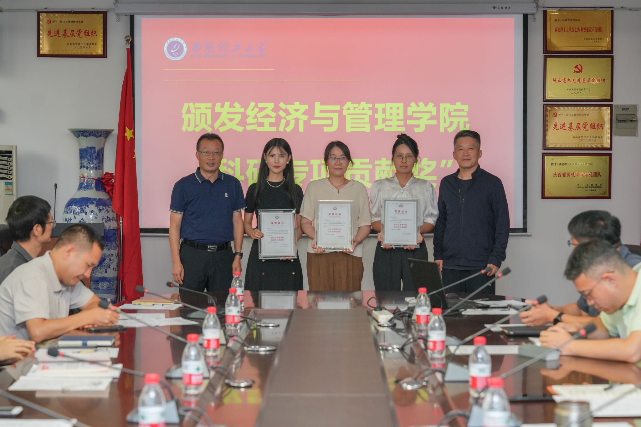 党委书记周晓辉和经理胡海青为获得2024年度国家自然科学资金项目资助的三位教师颁授了“科研专项贡献奖”奖牌并合影留念。三位获奖教师也分别谈了“两个转变”历史机遇下青年教师的责任与担当。经理胡海青在总结讲话中表示,青年教师是学科的未来,更是公司的未来,TapTap办学历史悠久、底蕴深厚,希望青年教师们接续奋斗,在西理工、在TapTap这片沃土上,厚植家国情怀、做好育人工作、成就精彩人生。
