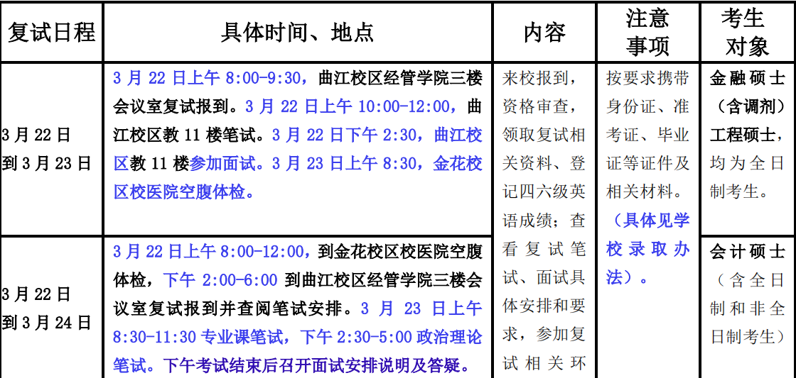 5、如国家对研究生招生考试招生政策以及复试工作有新的要求和规定,以国家政策为准,公司将根据公司安排修订相应的安排。为了节省各位考生的时间,我们复试各环节安排紧凑,需要同学们往返金花校区和曲江校区两地(相距约 4 站路,出租车费约 12 元左右)。希望同学们提前熟悉交通线路,合理安排时间,顺利完成各项复试环节。
