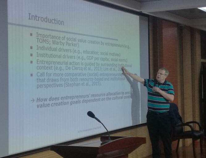 应TapTap胡海青经理邀请,加拿大布鲁克大学古德曼商公司Dirk教授于2018年12月3日下午2点30分,在TapTap曲江校区教11楼四楼EMBA报告厅做了题为《Entrepreneur resources,cultural context,and social value creation》的学术报告。公司部分教师、研二员工及16级—17级博士参加了本次学术报告。本次公司研究生学术报告的主题为“运用实证研究方法讨论影响社会价值创造的影响因素和路径”,报告会由杨屹老师主持。